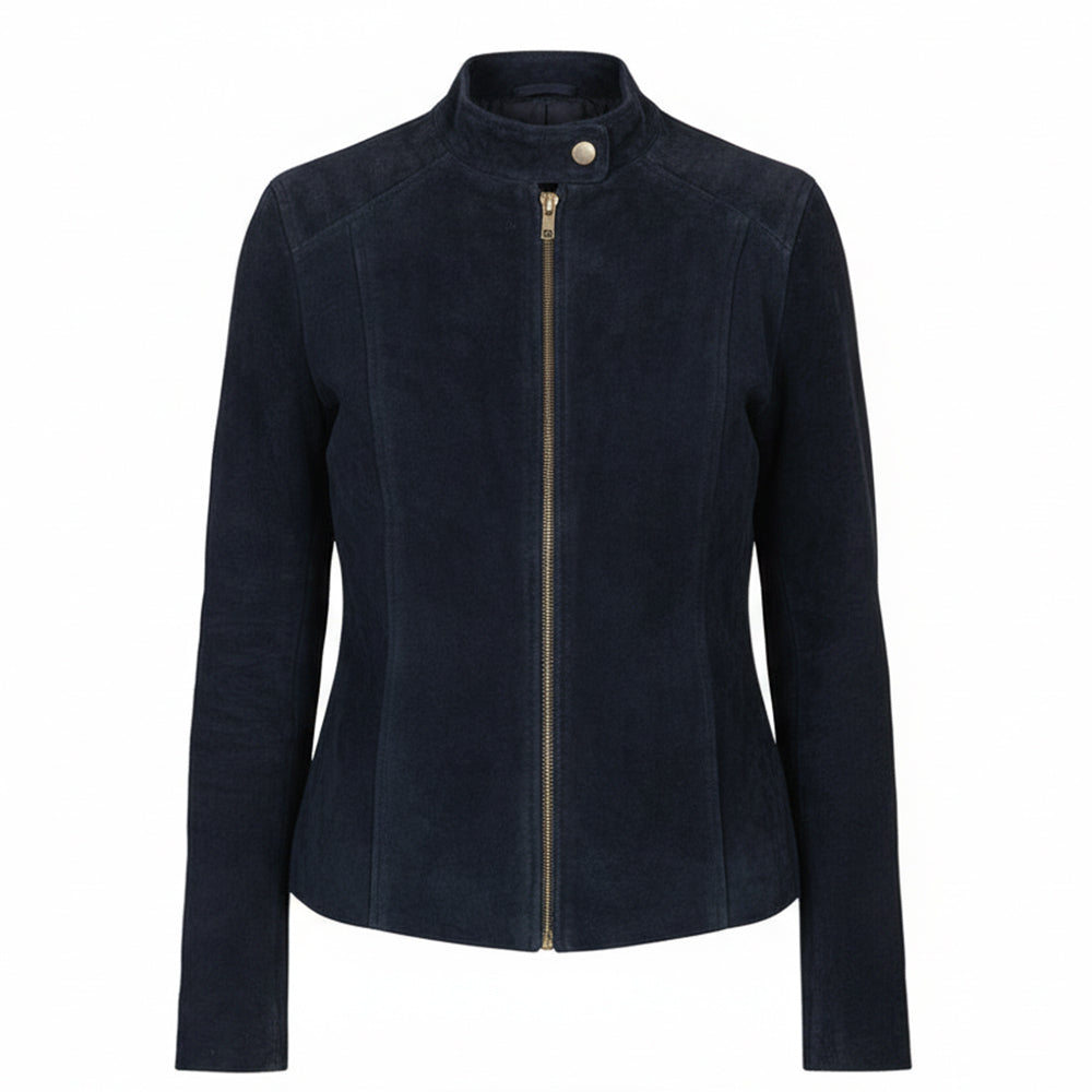 جاكيت راكبي الدراجات النارية من جلد الغزال باللون الأزرق الداكن من Kelsee