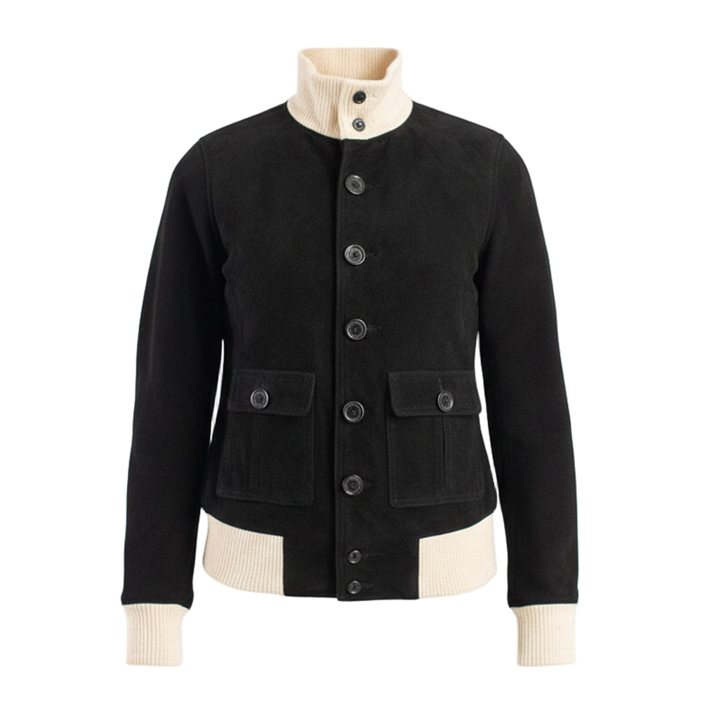 تفاصيل سترة Sasha A1 Bomber المصنوعة من جلد الغزال الأسود.