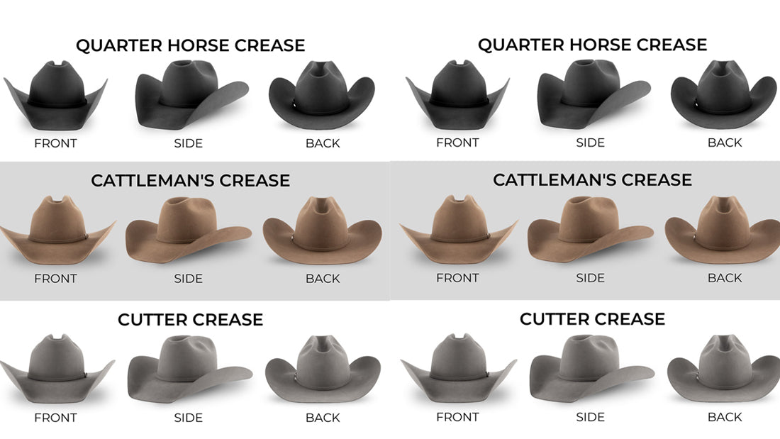 From the classic Cattleman Crease to the more rugged Gus Crease Every style has its own tradition and appeal. When choosing a crease, think about your face shape, your lifestyle, and your style. If none of the traditional creases work for you, make your personal style!