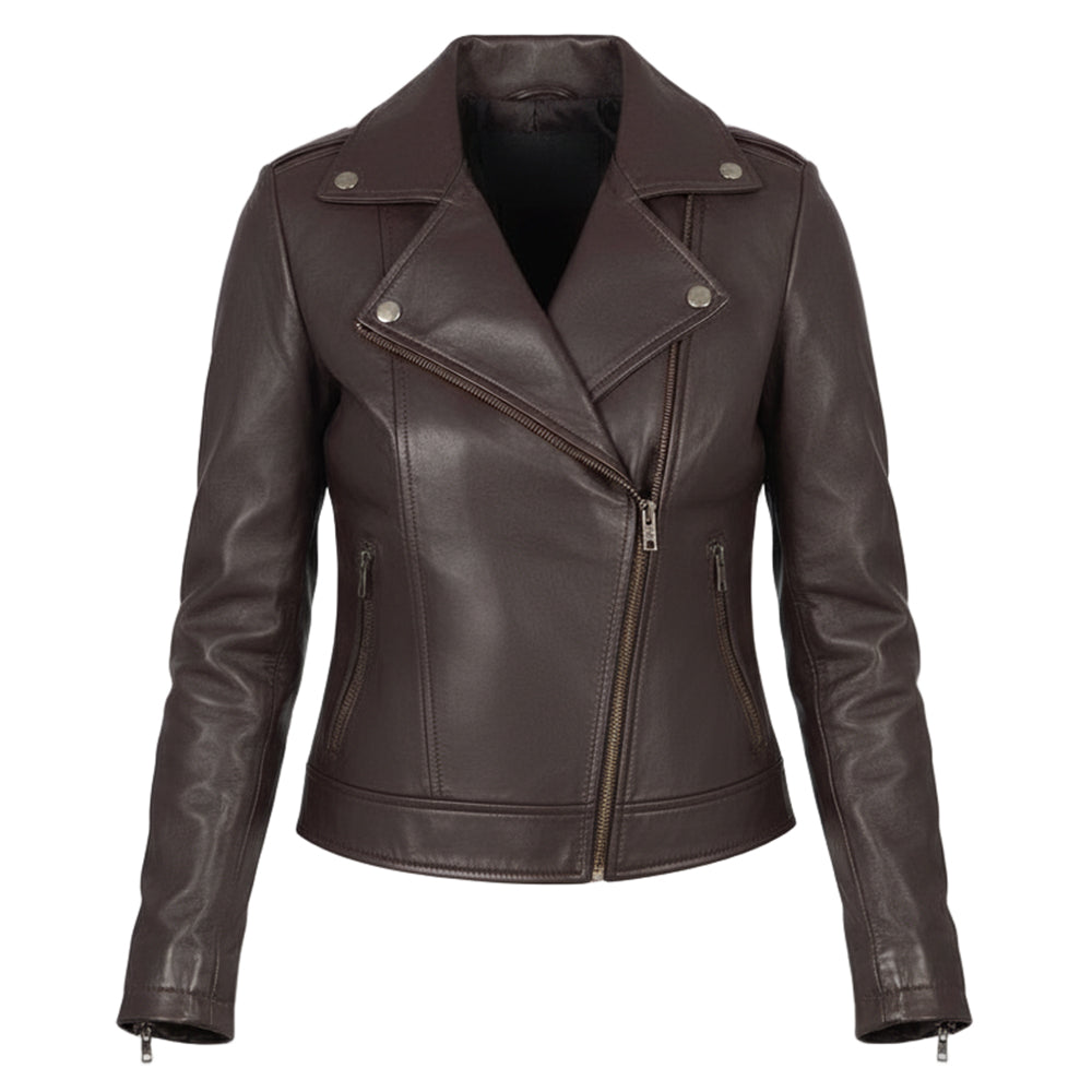 Tá gnéithe traidisiúnta seaicéad rothar le feiceáil ina seaicéad leathair donnrua. Ina measc tá:
