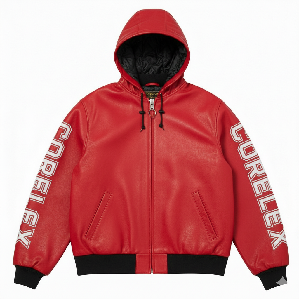 Rëndleder mat gestepptem Satin-Twill-Futter. Vollverschluss mat Paspelt-Drock-Handtaschen ënnen vir an bannenzegen Paspelt-Broschttaschen. Gestrickte Rippen un de Manschetten a Saum. Gestickte Logo-Patches op den Ärmelen.
