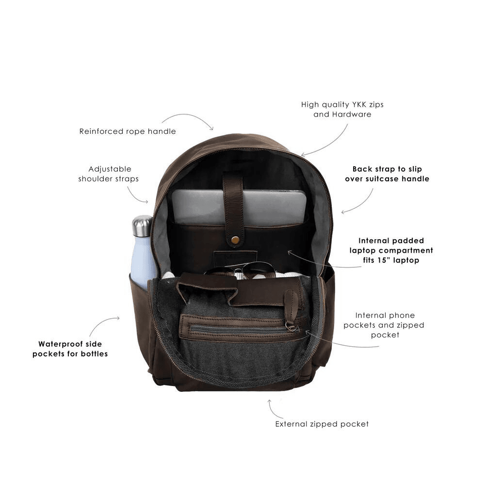 Gemaakt van het fijnste leer De rugzak is ontworpen met een diep donkerbruin exterieur dat in de loop van de tijd een unieke patina ontwikkelt, waardoor de vintage-look . De 100 procent katoenen voering biedt een zachte, gewatteerde laag voor uw artikelen, en zijn messing fittingen en de stevige ritsen van YKK zorgen voor een langdurige duurzaamheid en naadloze functionaliteit.