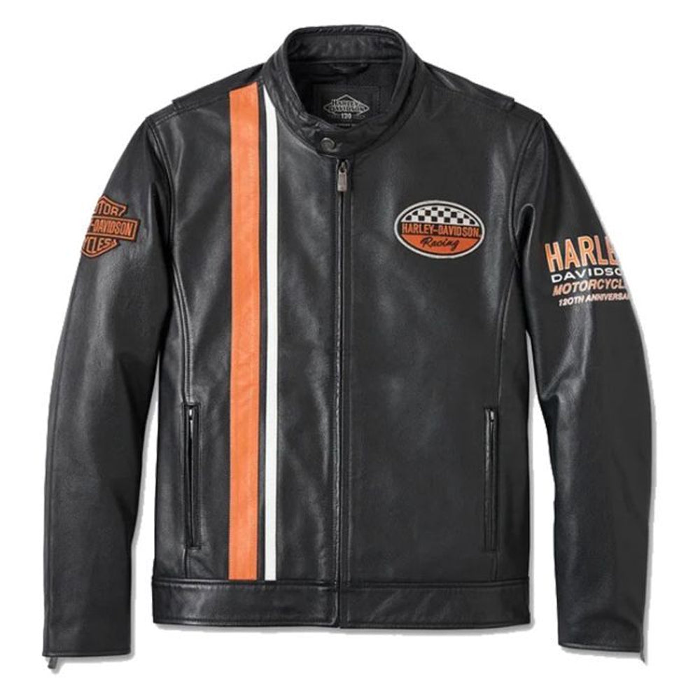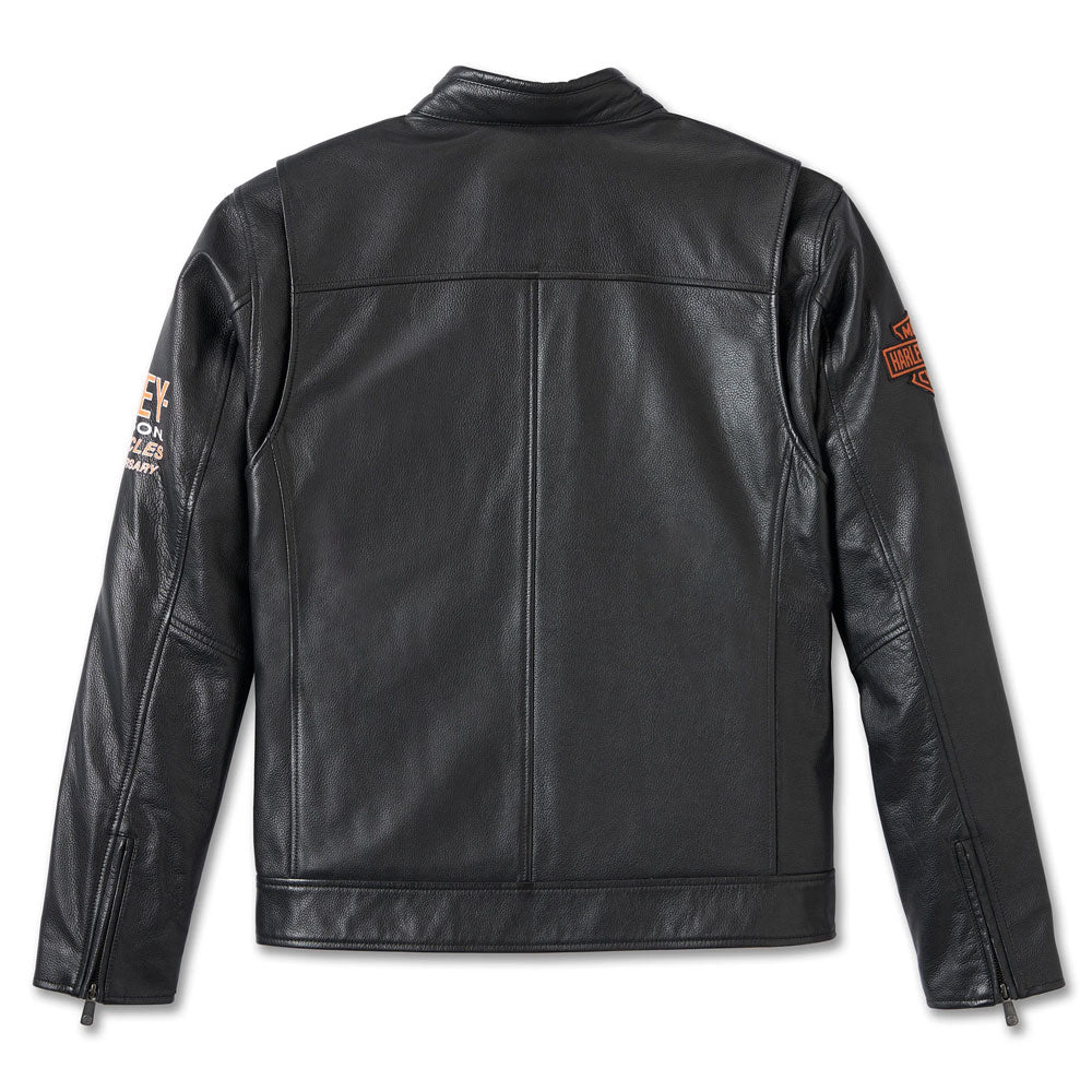 Detaljer om HD herreskinnjakke 120-årsjubileum i svart.