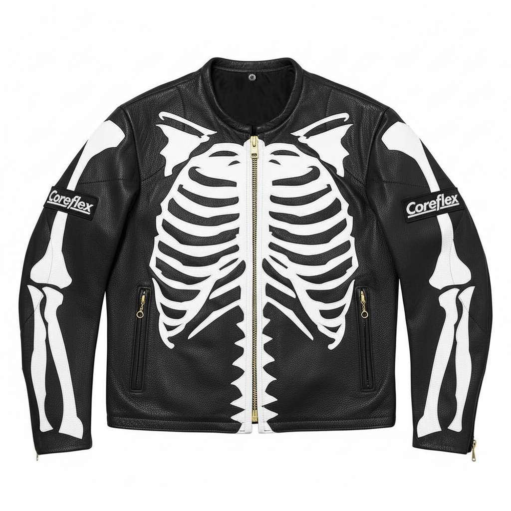 - Skreddersydd kuskinn i konkurransekvalitet med rayonfôr. Hel glidelåslukking med innvendige brystlommer og glidelåslommer for hånden nederst foran. Utskårne skjelettbein i skinn foran, bak og på ermene med merkelapper på ermene.