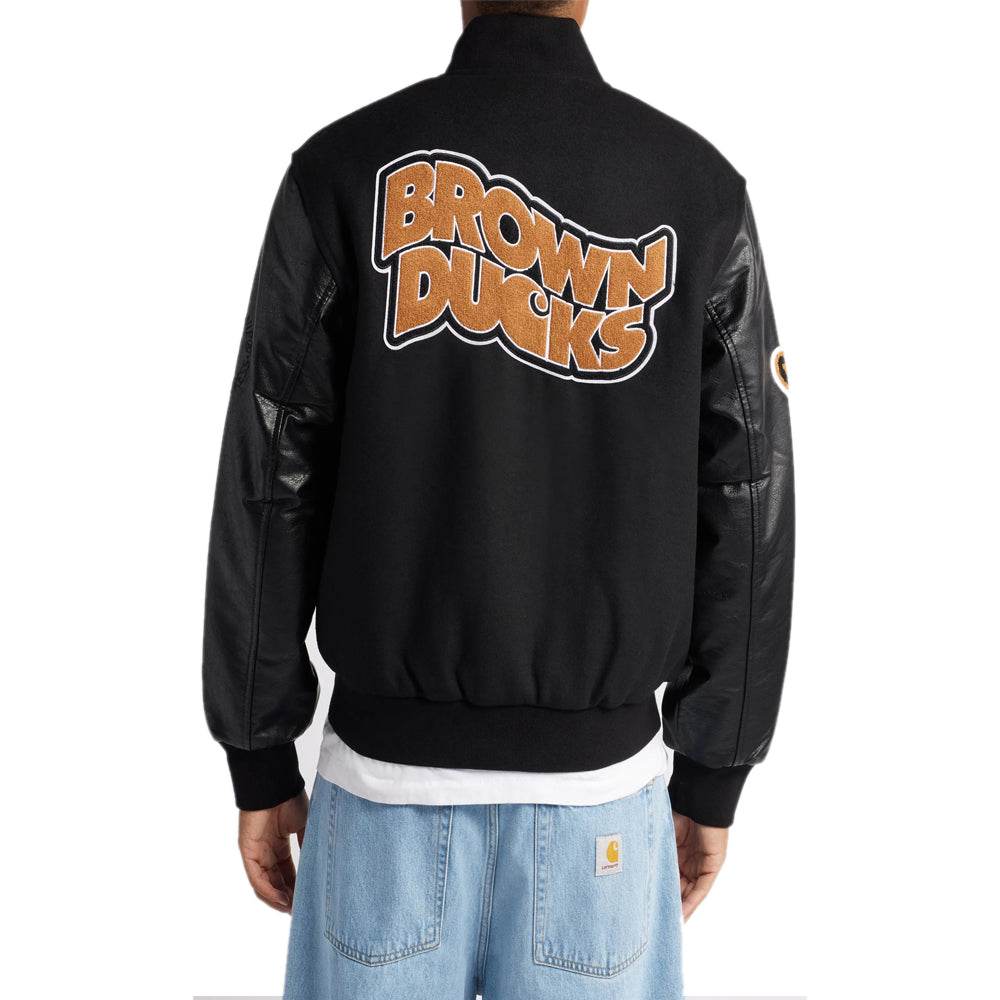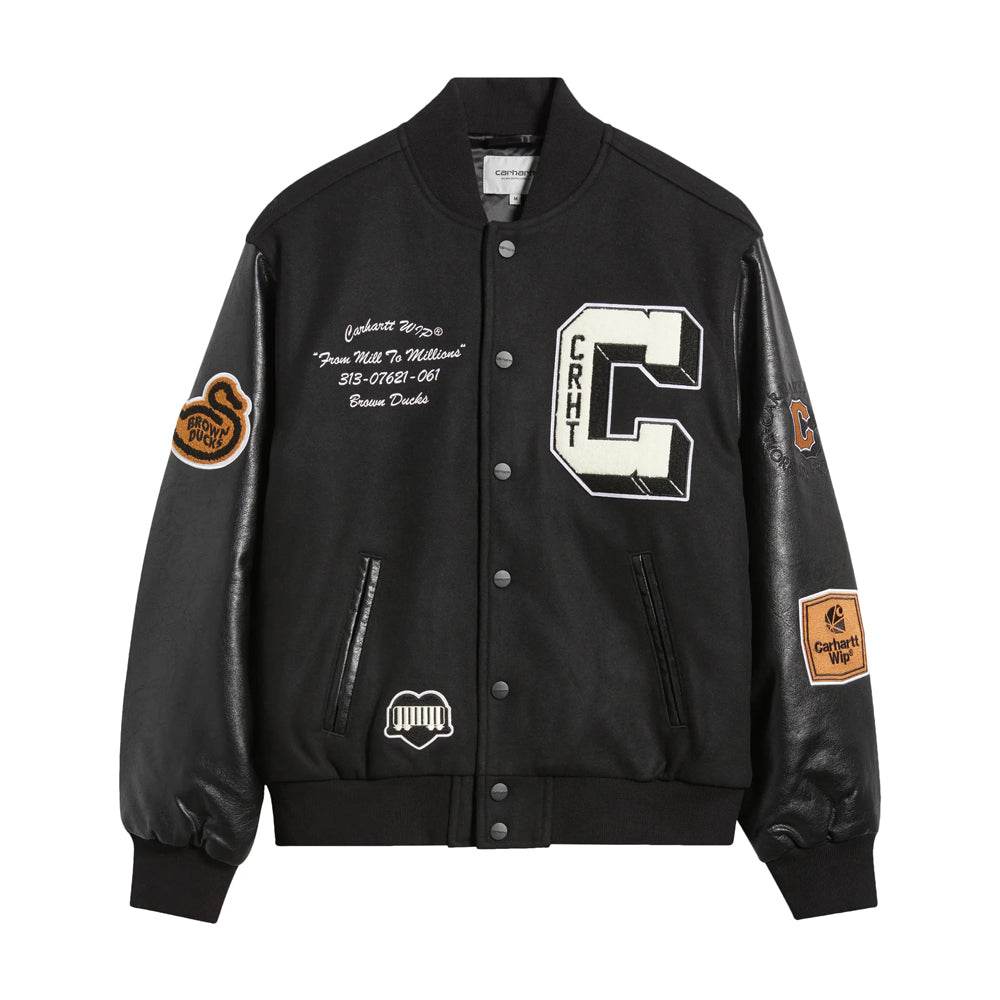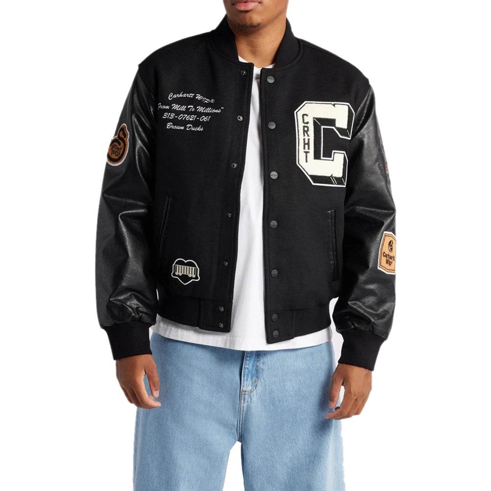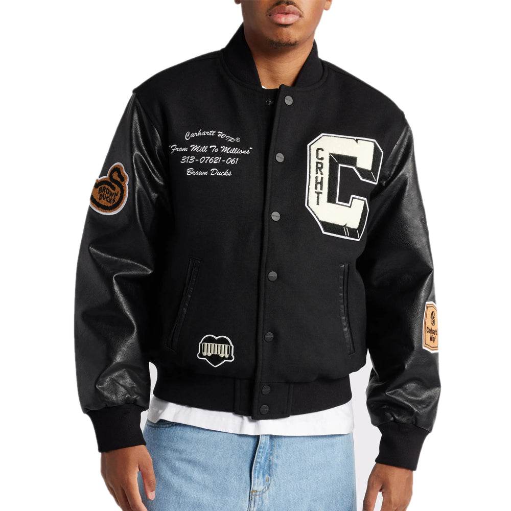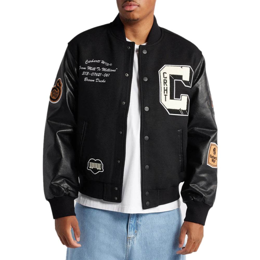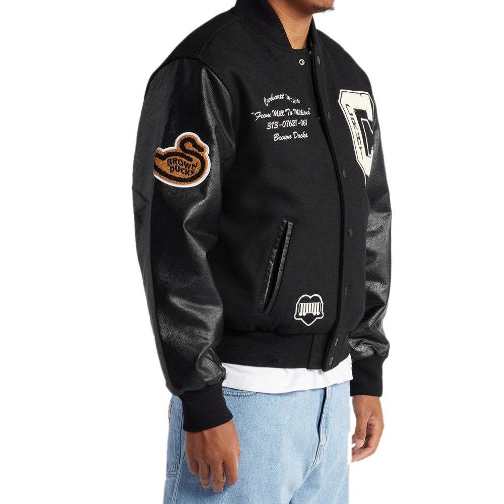 The beloved American workwear brand takes a collegiate-inspired twist with this mixed-media bomber jacket textured with varsity-style patches.