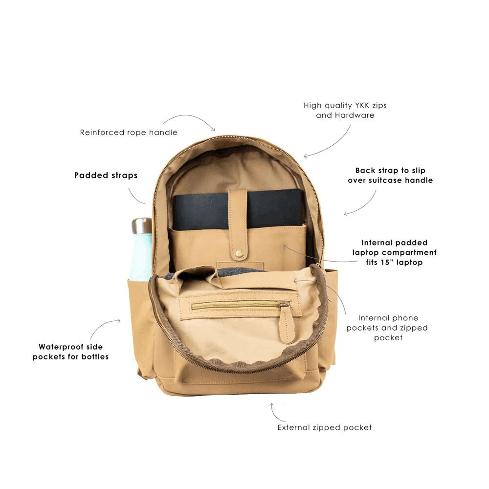 Features: Extendable back straps, front zip pocket, internal zip pocket, two internal compartments, padded laptop compartment for a 16" Macbook, horizontal external strap which can be used to slot over wheelie suitcase handles, two external side pockets for water bottles complete with waterproof lining.