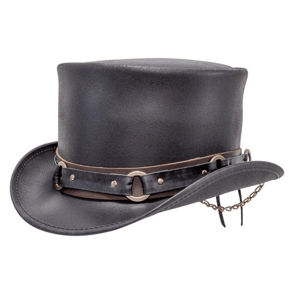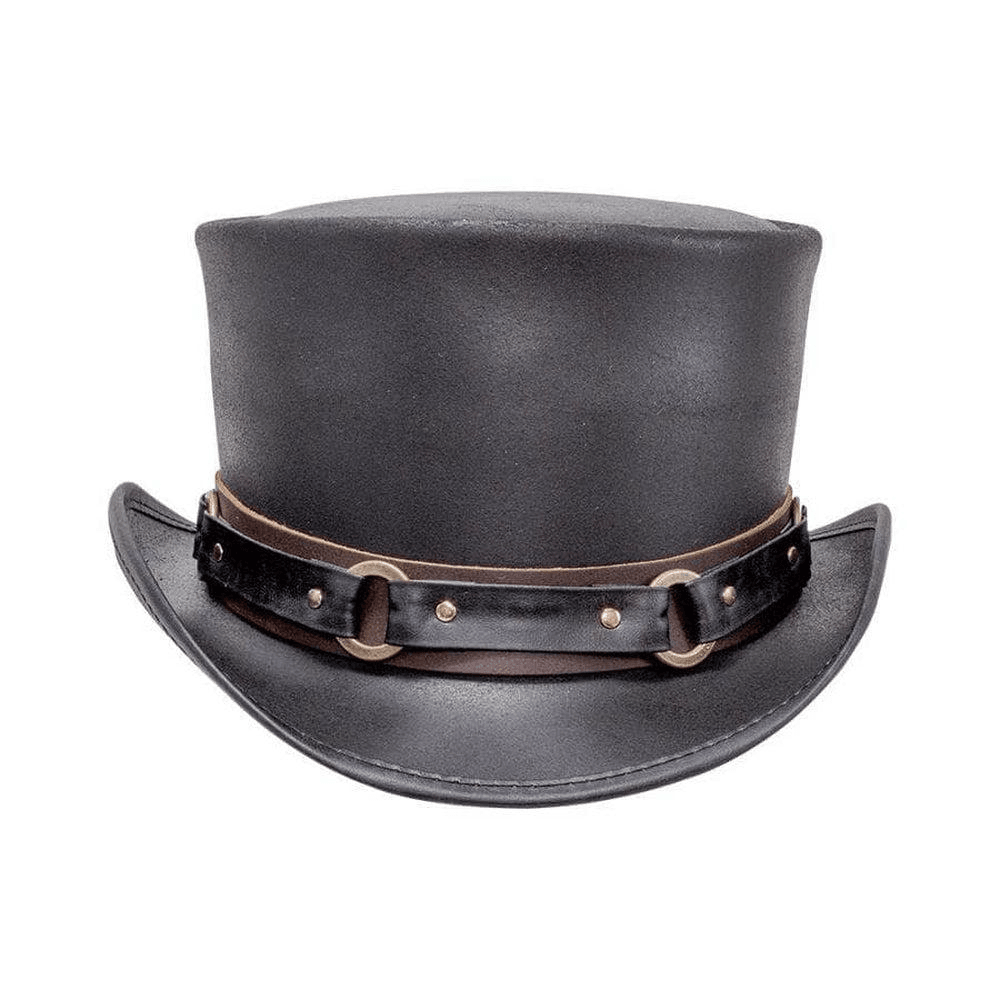 Inside every one of us beats the heart of a hero. The Voodoo Hatter El Dorado leather top hat with SR2 band is made to compliment your long-coat as you step from the darkness into the neon night and battle the enemies of ultimate cool. Featuring a super comfortable removable sweatband liner that attaches securely with velcro tabs sewn-in to the hat. Easily swap the liner for a half or full-size reducing sweatband (included with purchase) to achieve the perfect fit.
