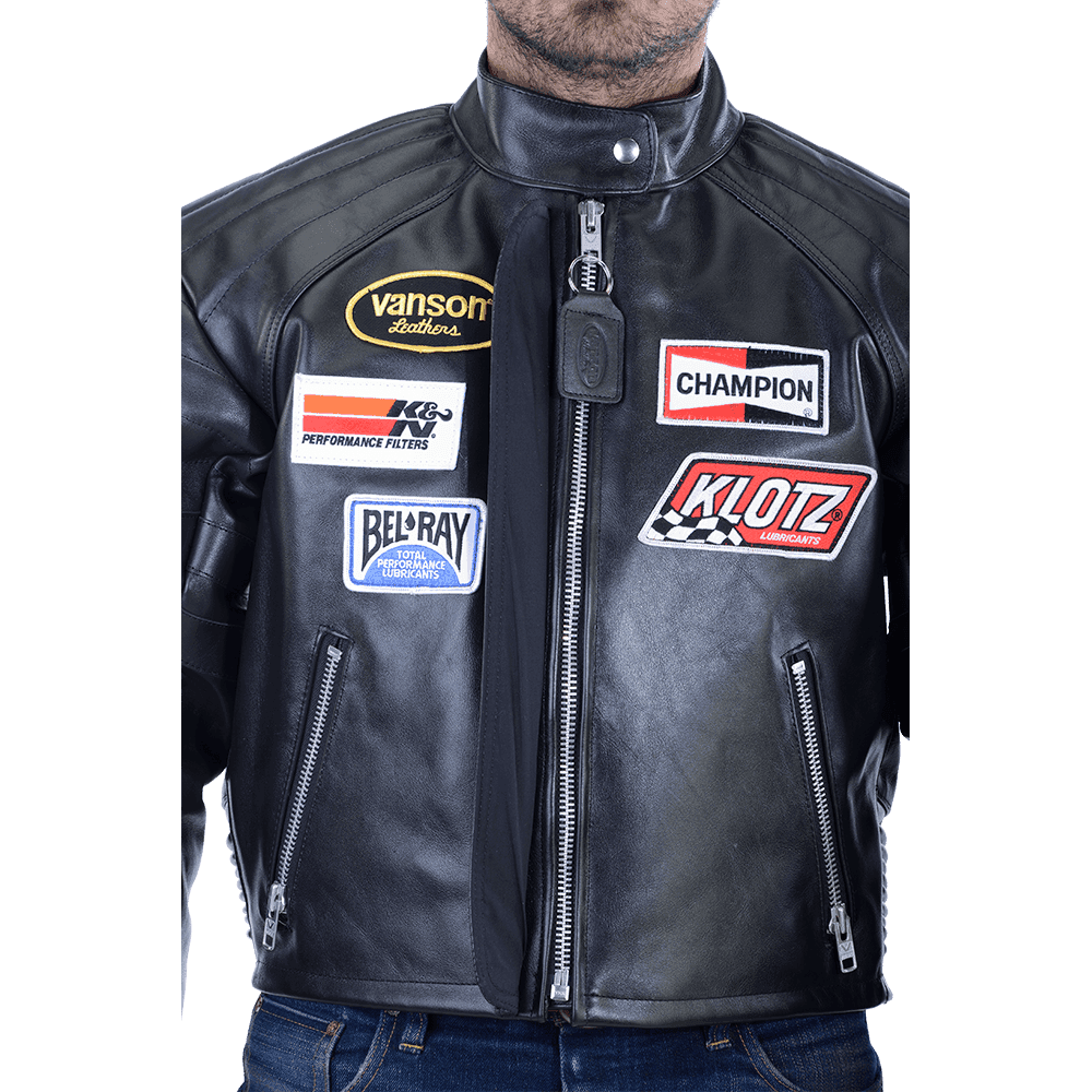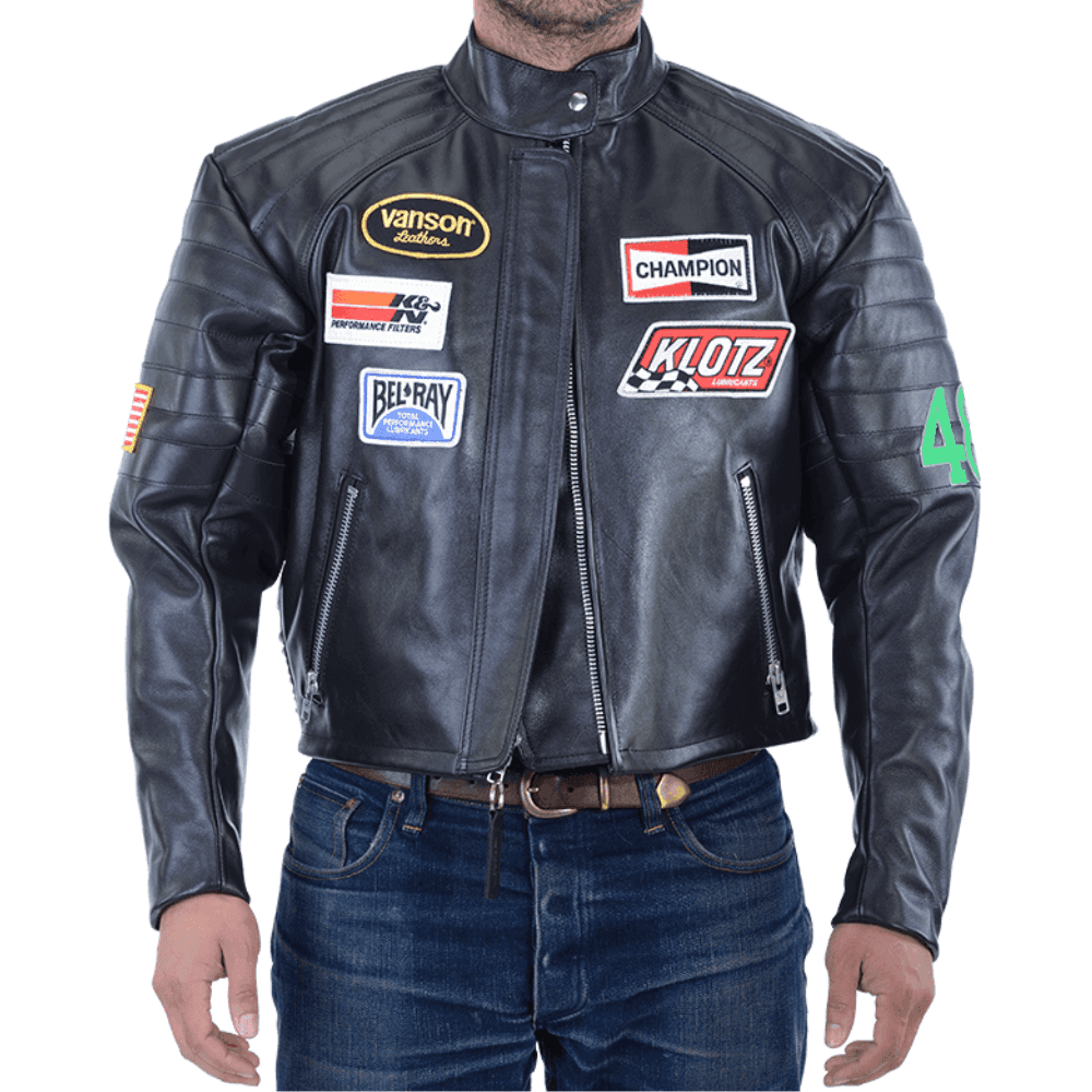 Assorted racing patches are sewn into the leather exemplifying its racing origins.