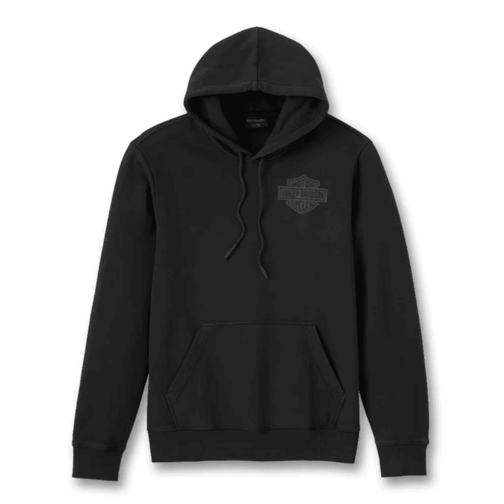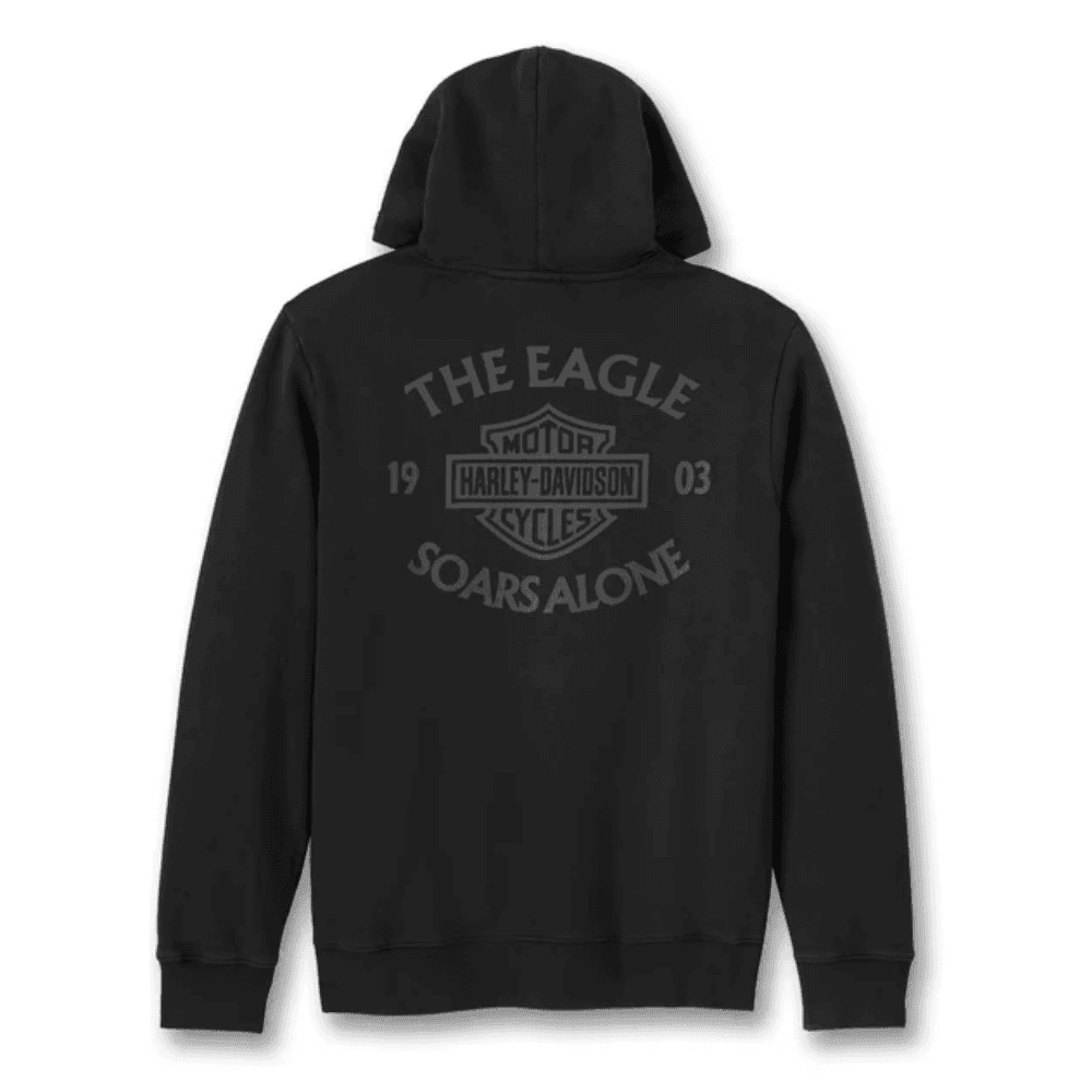 Throwback style honors our proud independence in the Eagle Soars Alone Slub Hoodie. This relaxed-fit pullover hooded sweatshirt is cut from heavyweight cotton slub fleece that’s garment dyed for a well-worn look and feel. Features graphics that give a nod to our rich history. In fact, “The Eagle Soars Alone” slogan on back marks Harley-Davidson’s return to a private company after parting ways with AMF in 1981.