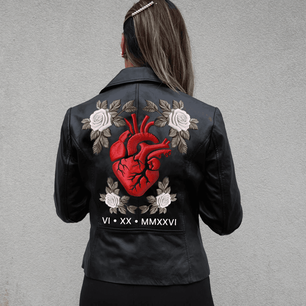 (Real Leather) Embroidered Heart Leather Jacket, Custom Mrs Jacket, Customized Wedding Jacket, Personalized Bridal Leather Jacket, Personalized Leather Jacket, Wedding Leather Jacket for the Bride, Bridal Leather Jacket, Black Leather Jacket, Black Bridal Wedding Jacket, Black Bride Leather Jacket, Bachelorette Party Leather Jacket, Leather Jacket for Bride, Custom Bride Jacket, Bridal Cover Up