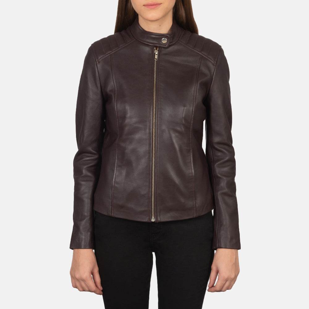 Details of the Kelsee Maroon Leather Biker Jacket.