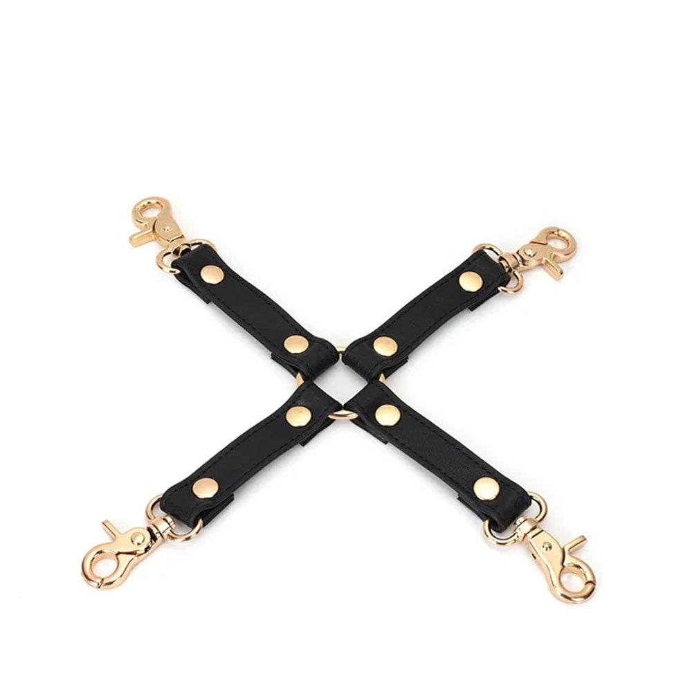 This timeless black leather hogtie has premium leather construction for durability and strength Four quick-release clips that allow easy attachment and removal. Gold hardware accents to give it a refined look. It is compatible with many bonding accessories