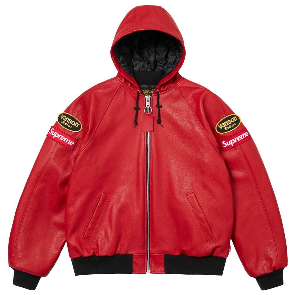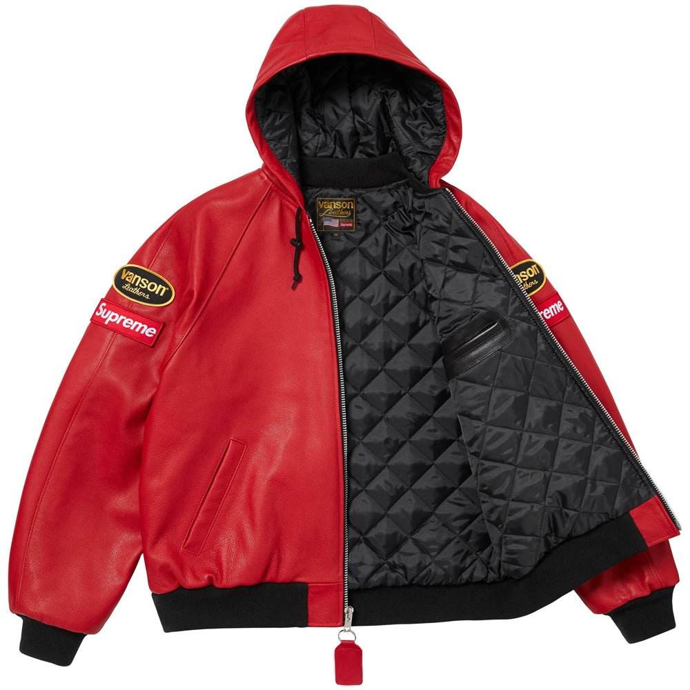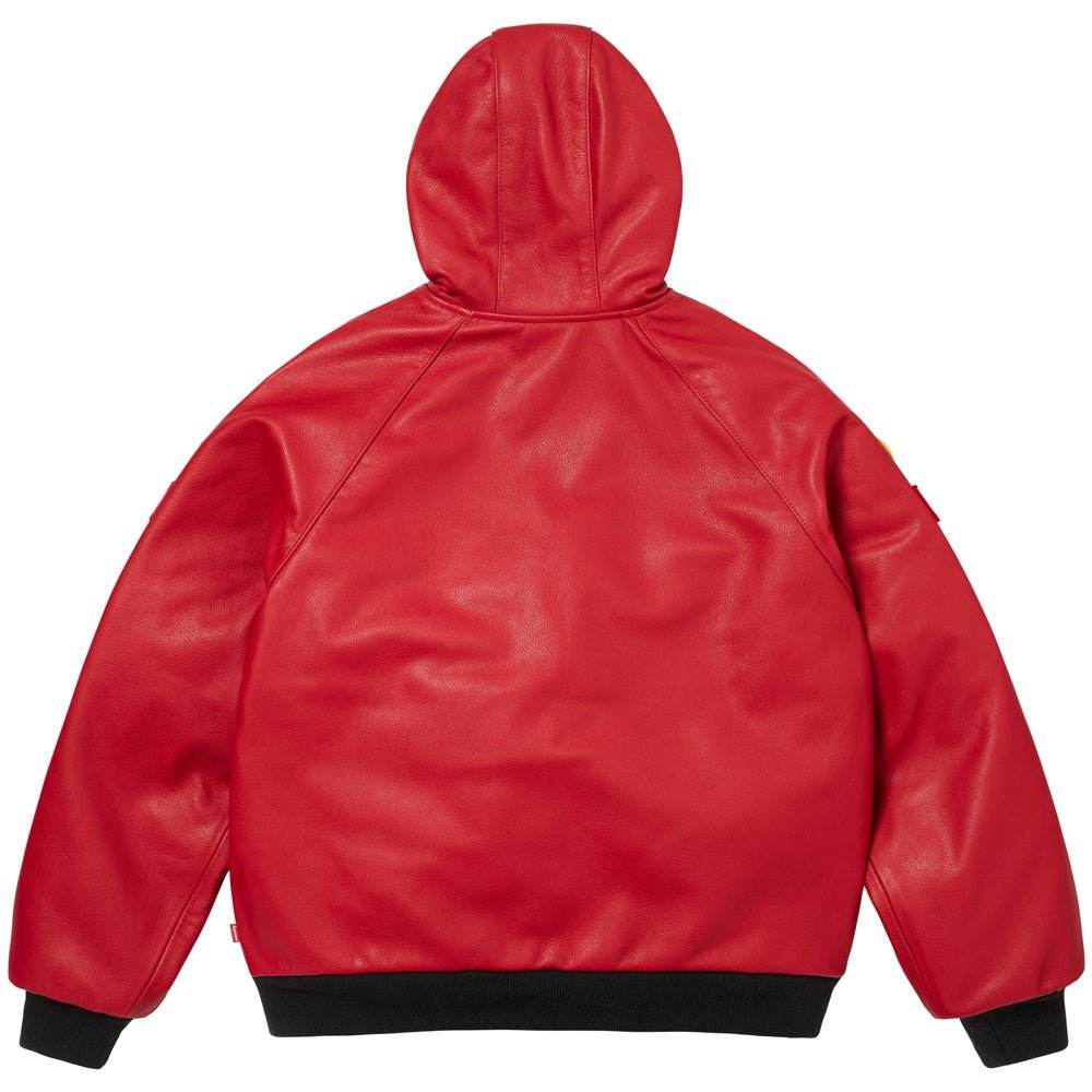 Cowhide leather with quilted satin twill lining. Full zip closure with welt snap hand pockets at lower front and interior welt chest pockets. Knit rib cuffs and hem. Embroidered logo patches on sleeves.