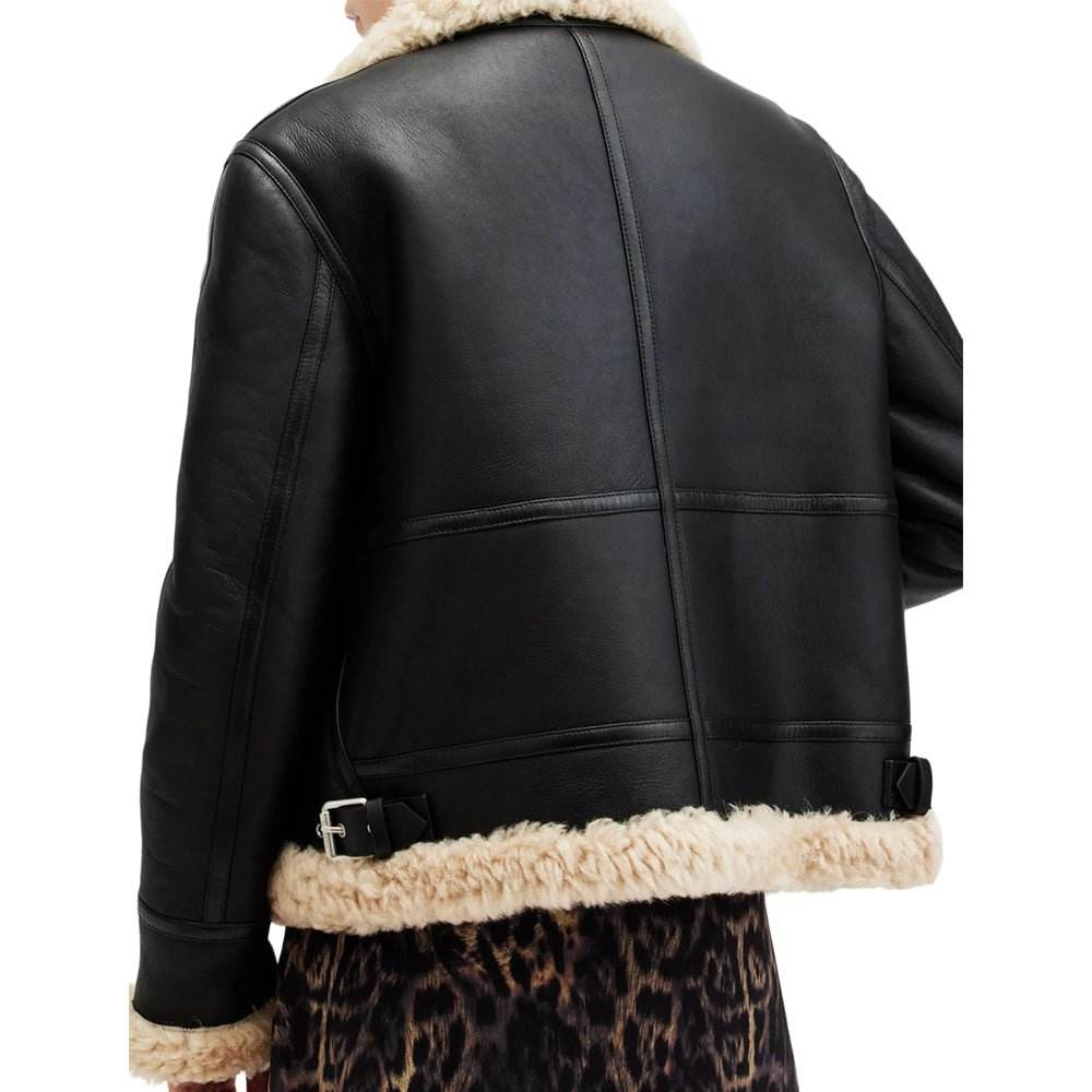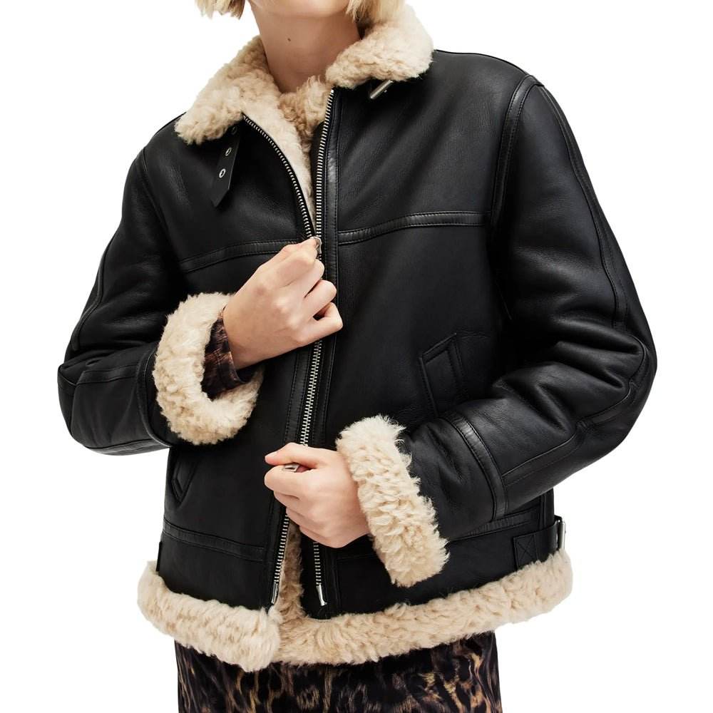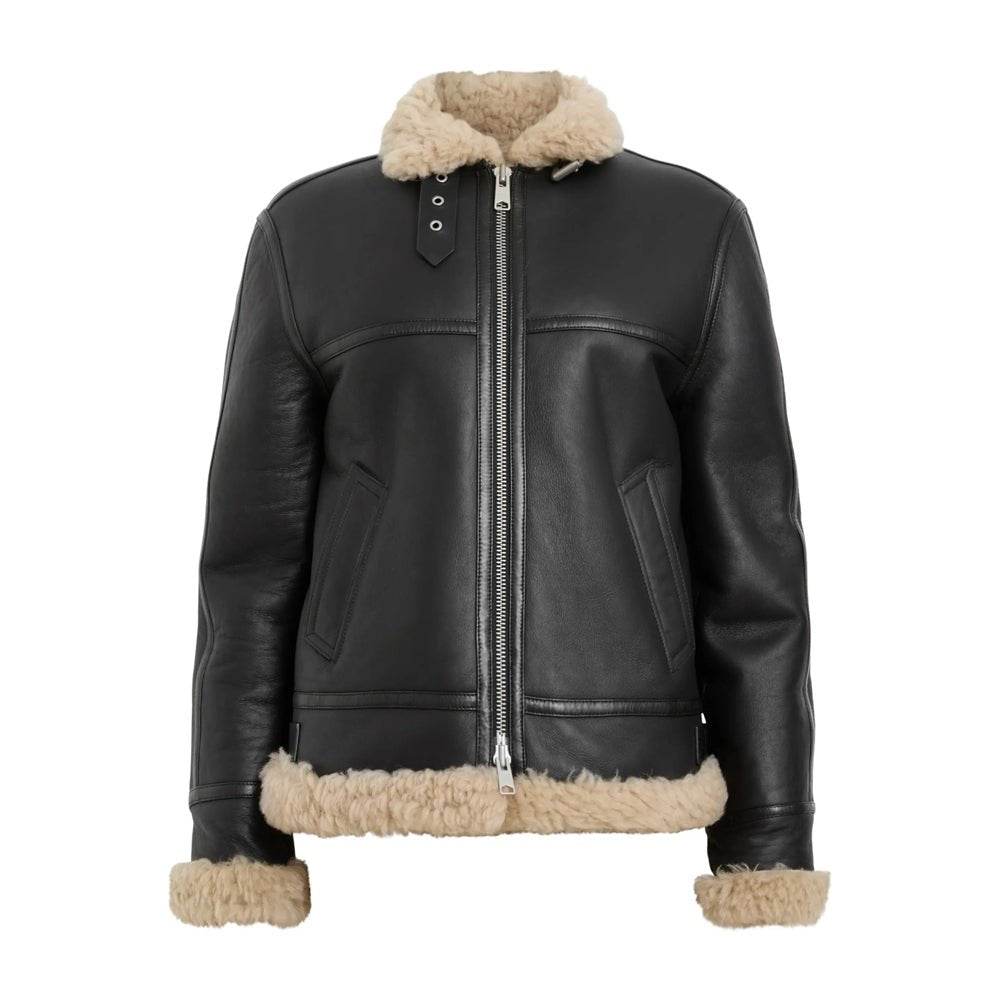 Curly shearling trim and smooth lambskin leather create striking contrast on a timelessly cool flight jacket in a relaxed silhouette.