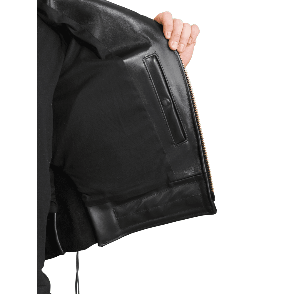 - CCW (Concealed Carry) Gun Pocket - The jacket has an interior gun pocket lined in leather that is designed to provide private and secure gun storage.