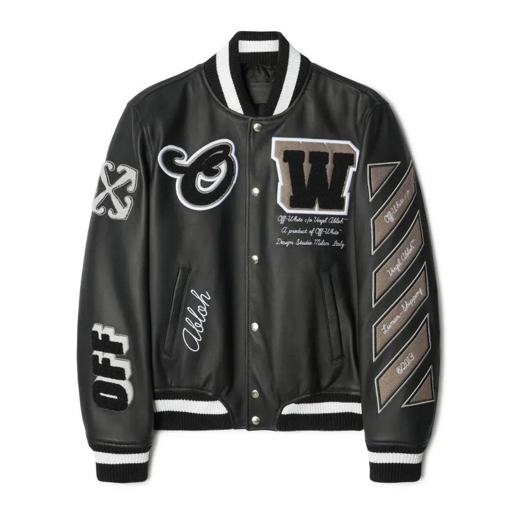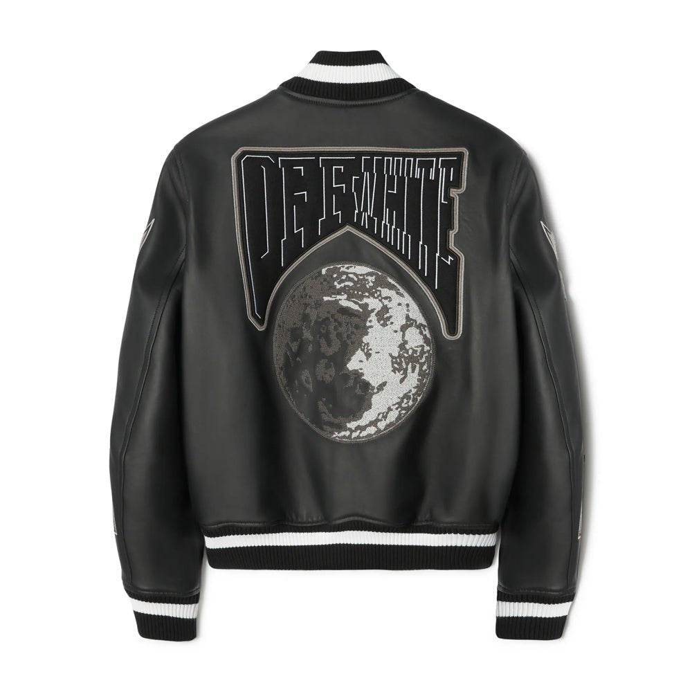 Black leather varsity featuring black and white Off-White logo patches and scripts at front. Grey diagonal details on the long sleeves. Black and Grey Off-White logo and moon detail at back.