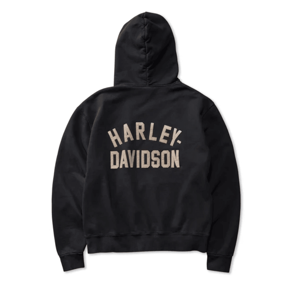 In contrast to standard hoodies, this Pullover sweatshirt is a standout with distinct washes and treatments that ensure each piece is unique, resulting in a unique character. The stone-washed, cotton fleece is not just durable but also offers a tough vintage style. It is influenced by Harley-Davidson's 1930s racing clothing The printed felt appliques that are adorned with the zigzag stitching make for a striking statement that is in line with the essence of classic motorcycling.