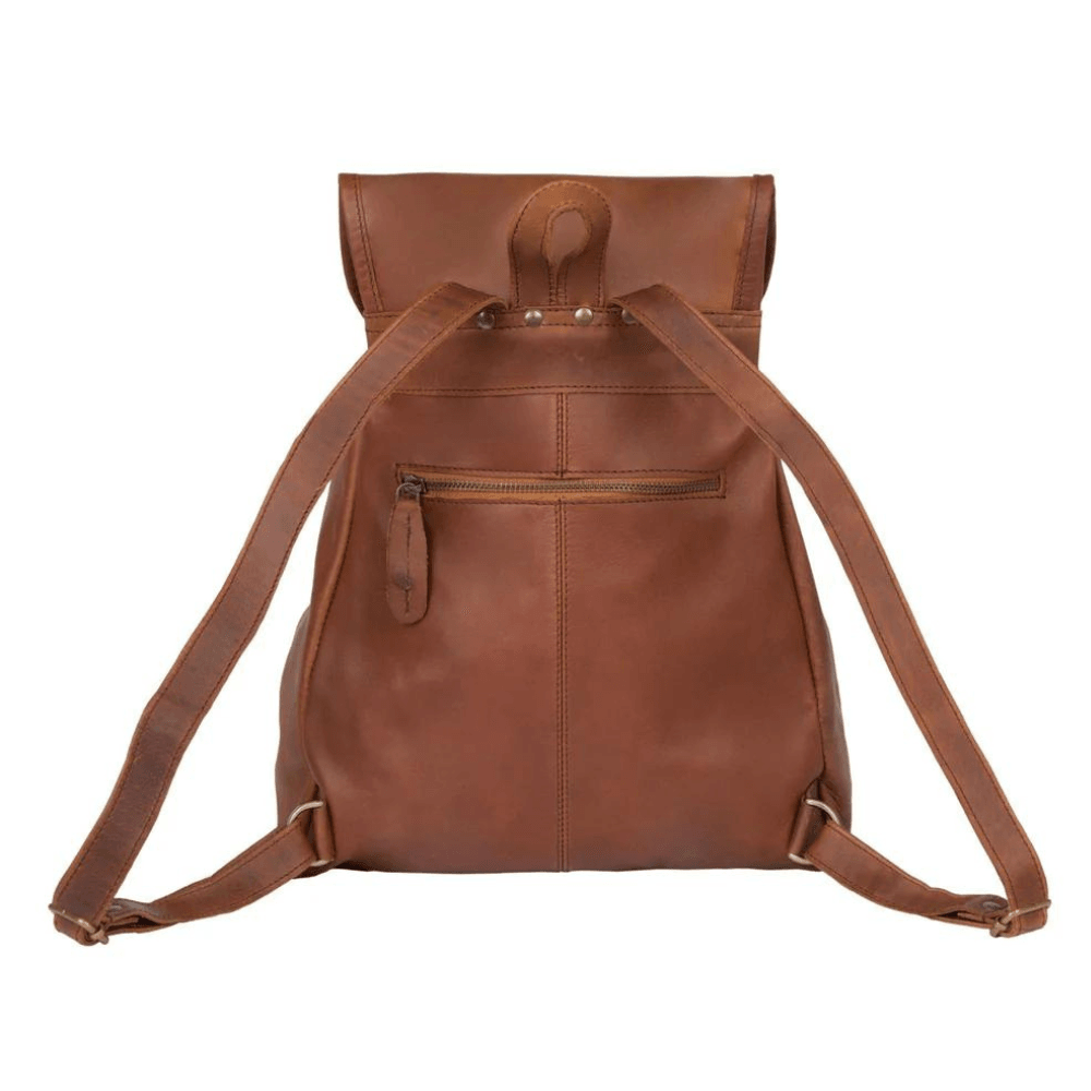 Features: Extendable back straps, front pocket with popper fastening and buckle detailing, back zip pocket, internal zip pocket, leather flap secured with buckle over the zip closure.
