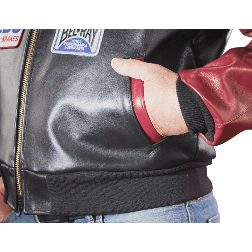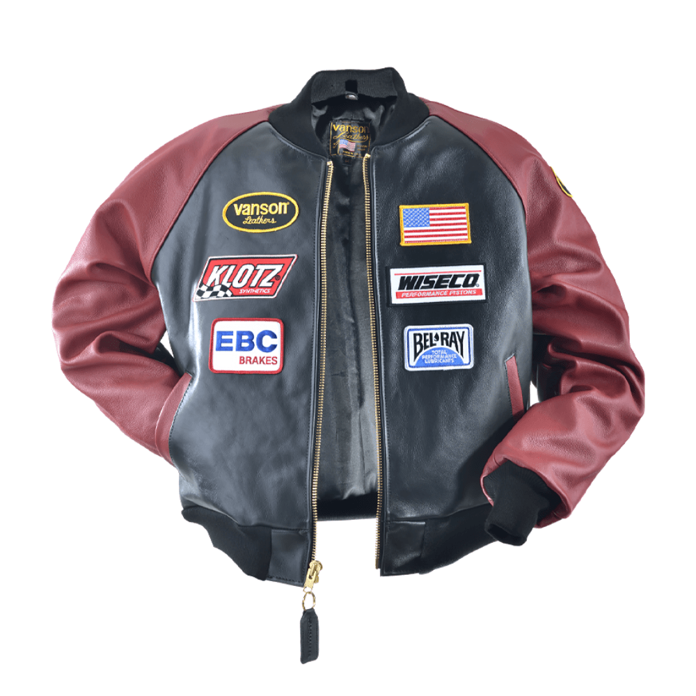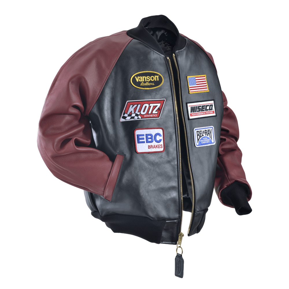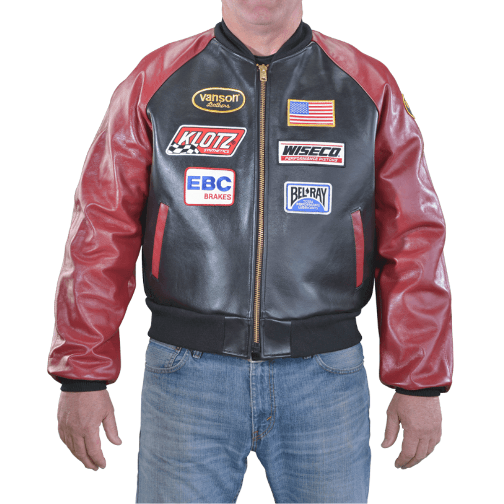 - Assorted racing patches stitched to jacket
