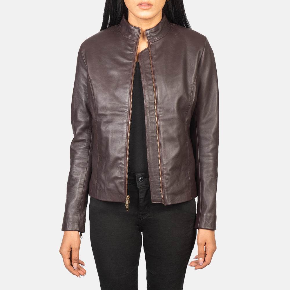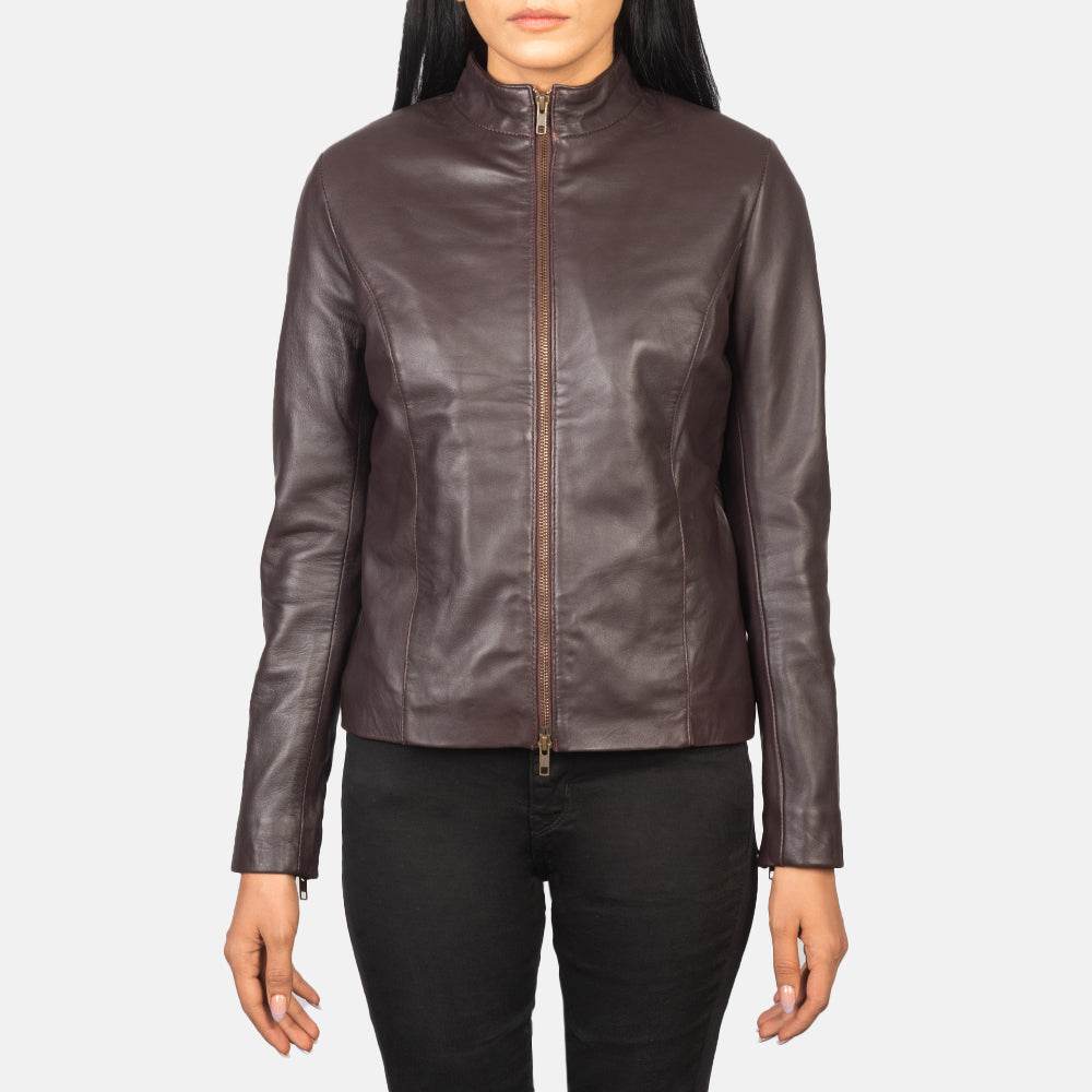 Detail of the Rumella Maroon Leather Biker Jacket.