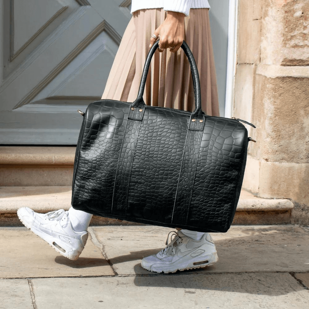 Features: Deep design ideal for tight spaces without losing out on storage. Extendable detachable shoulder strap, small inside zip pocket, four brass studs on the base.