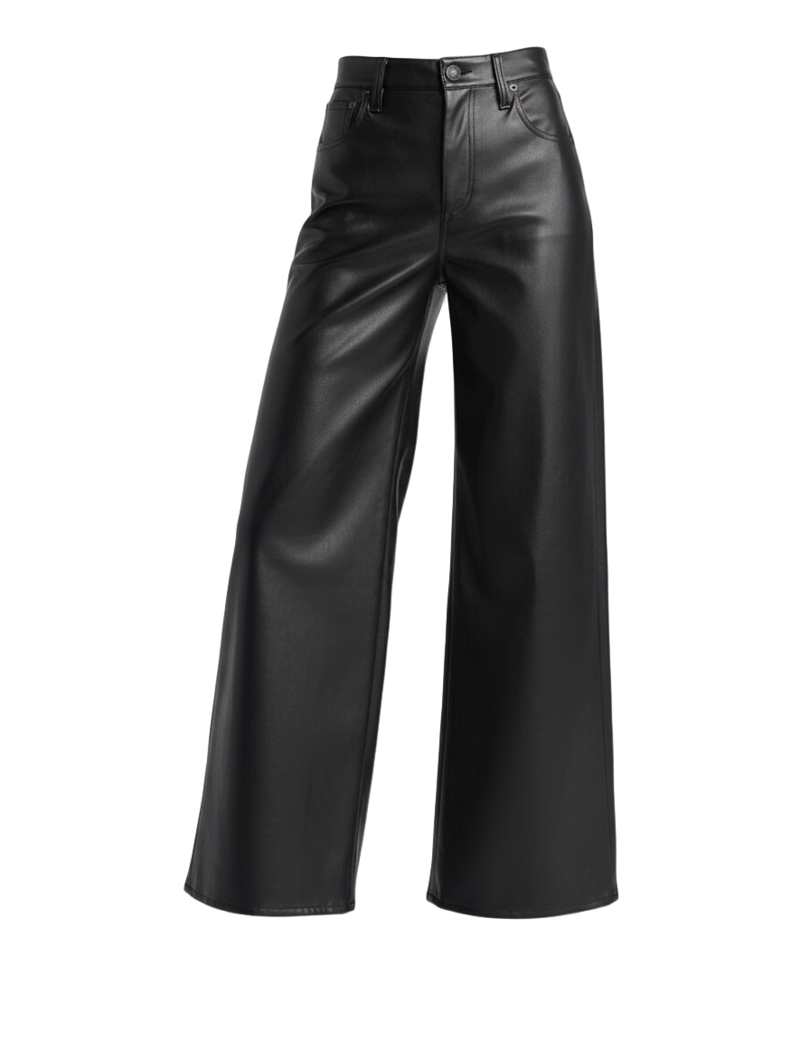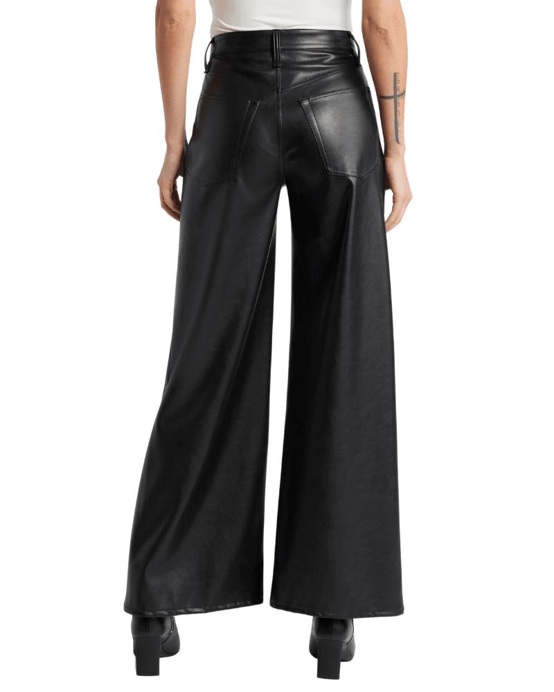 Edgy faux leather shows its softer side in these flat-front pants fashioned in a breezy, wide-leg silhouette.