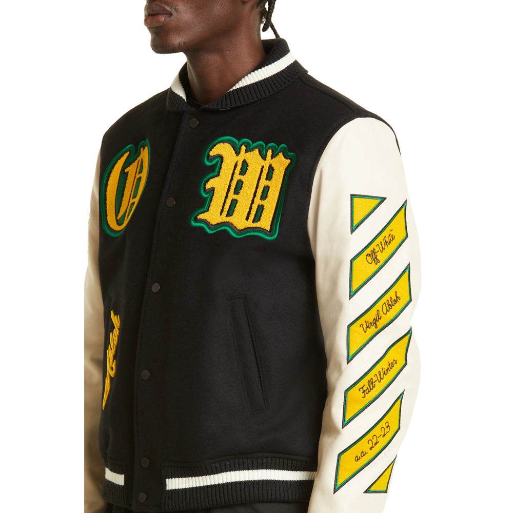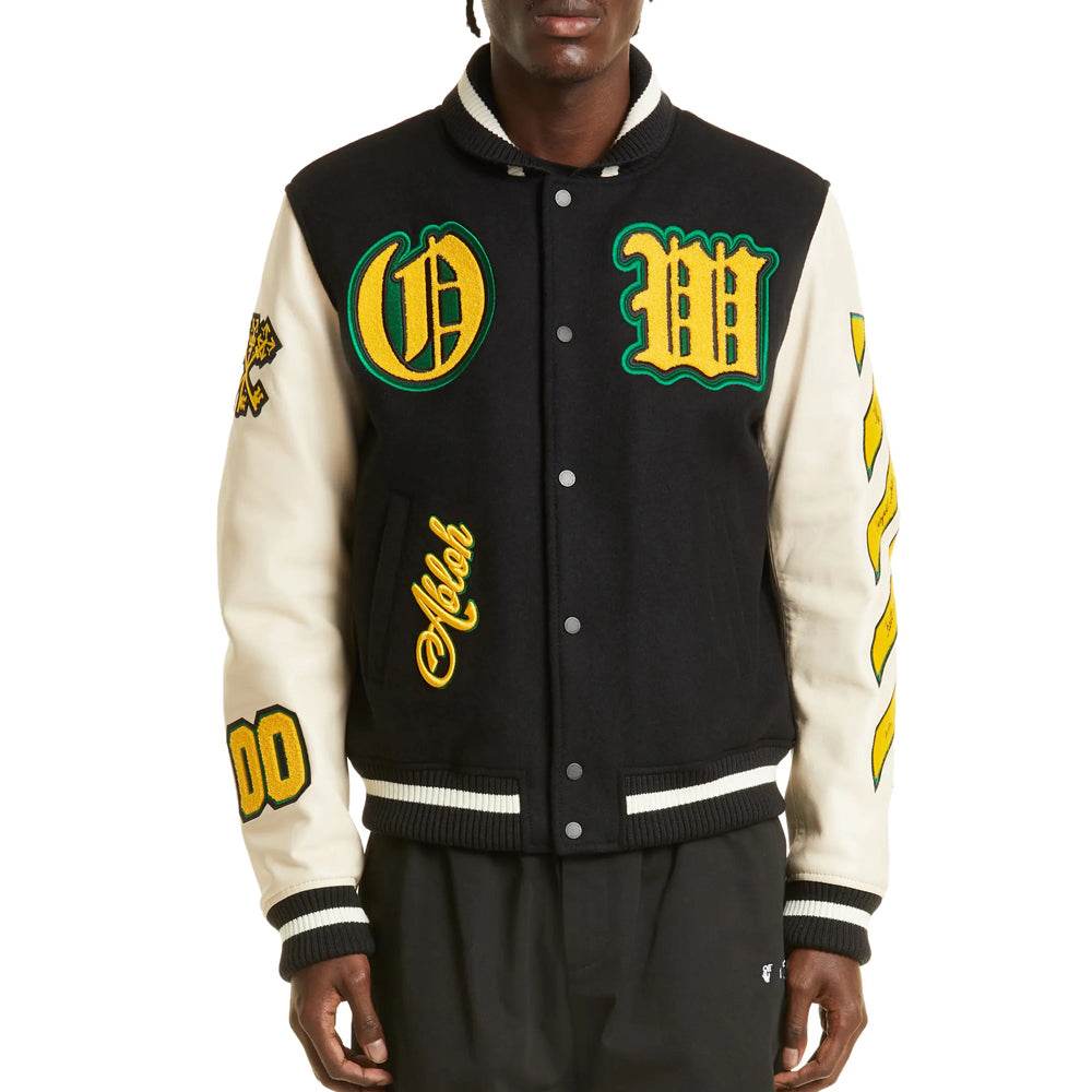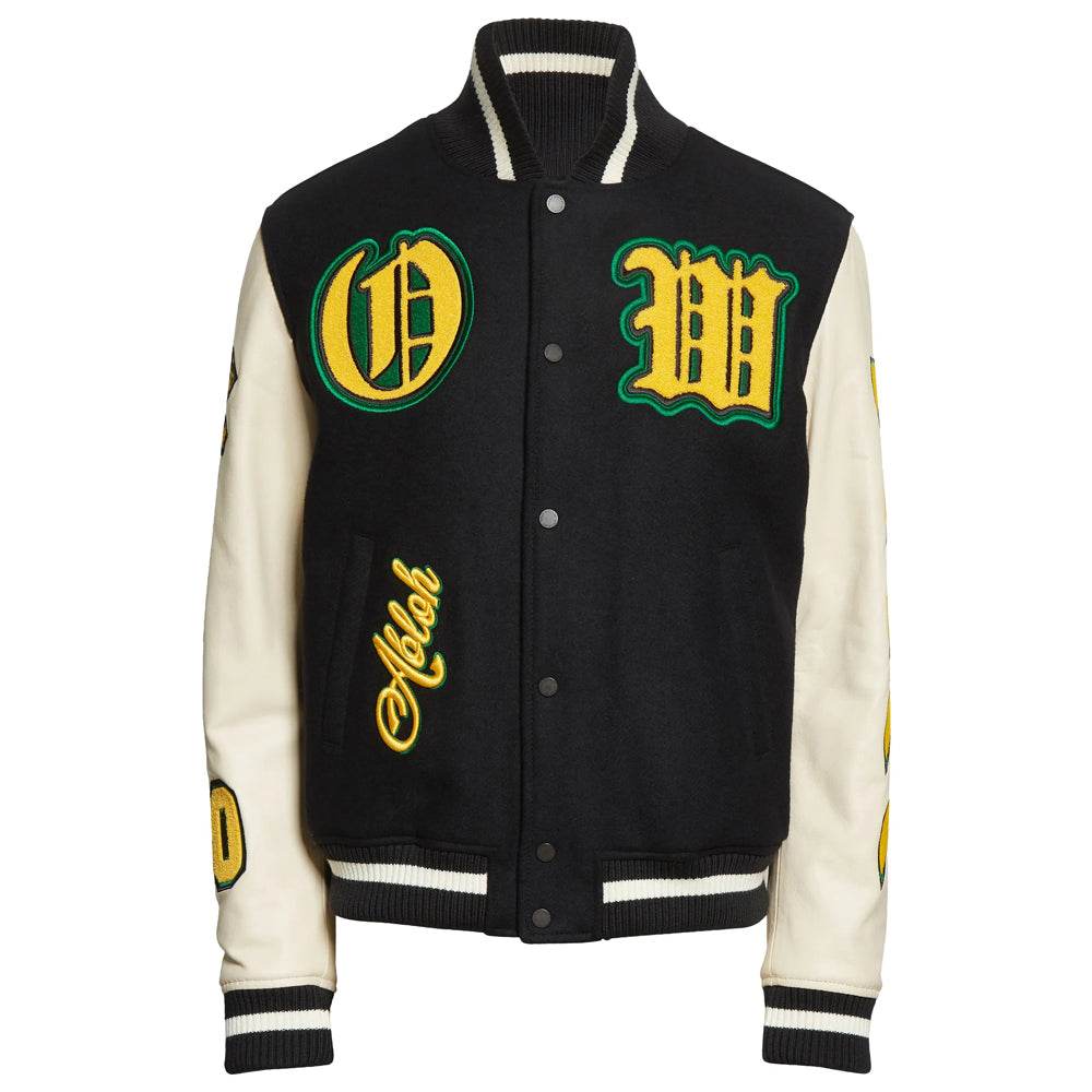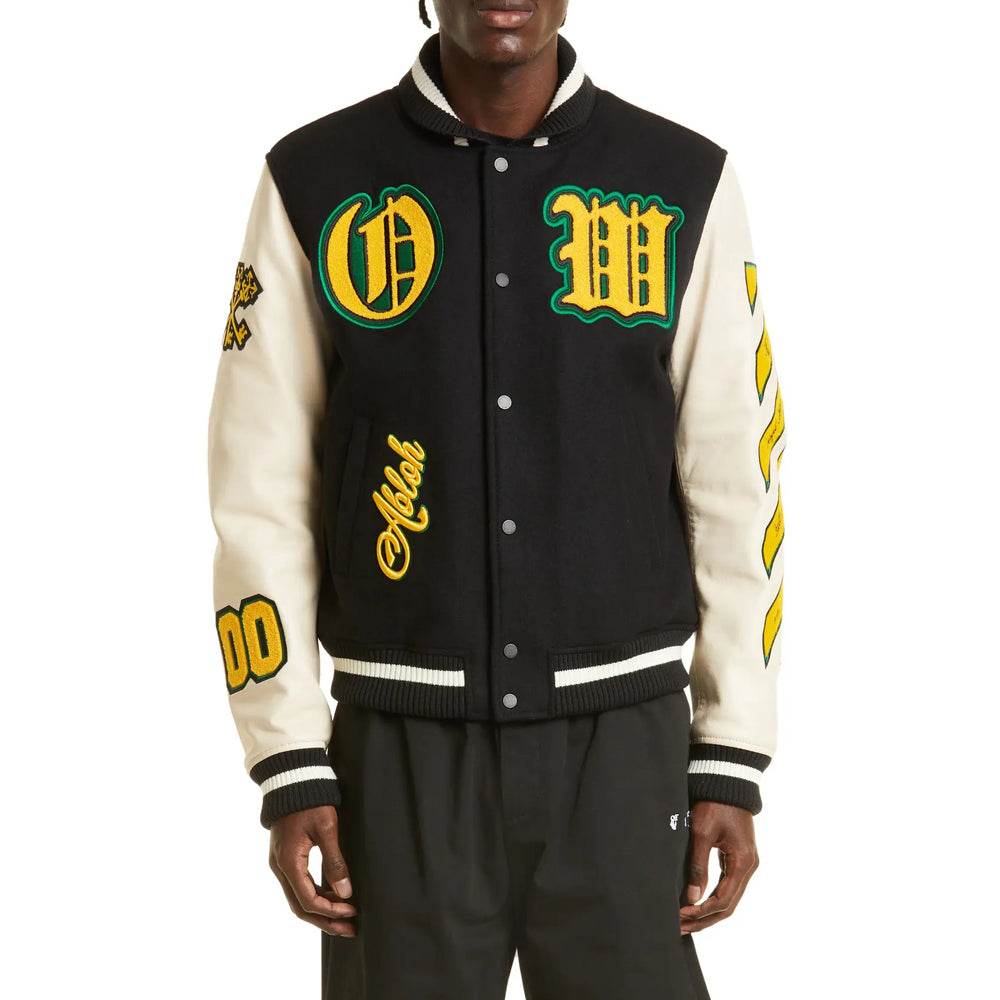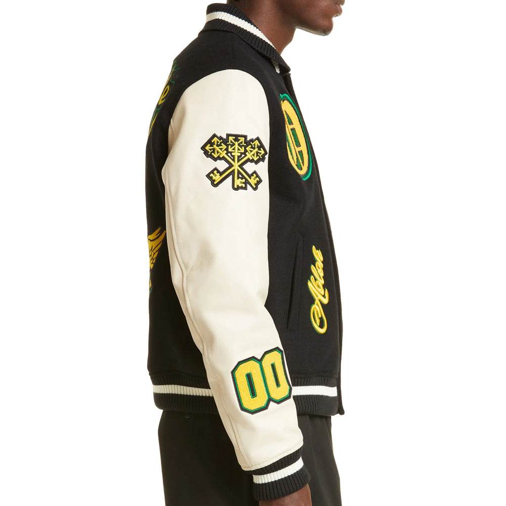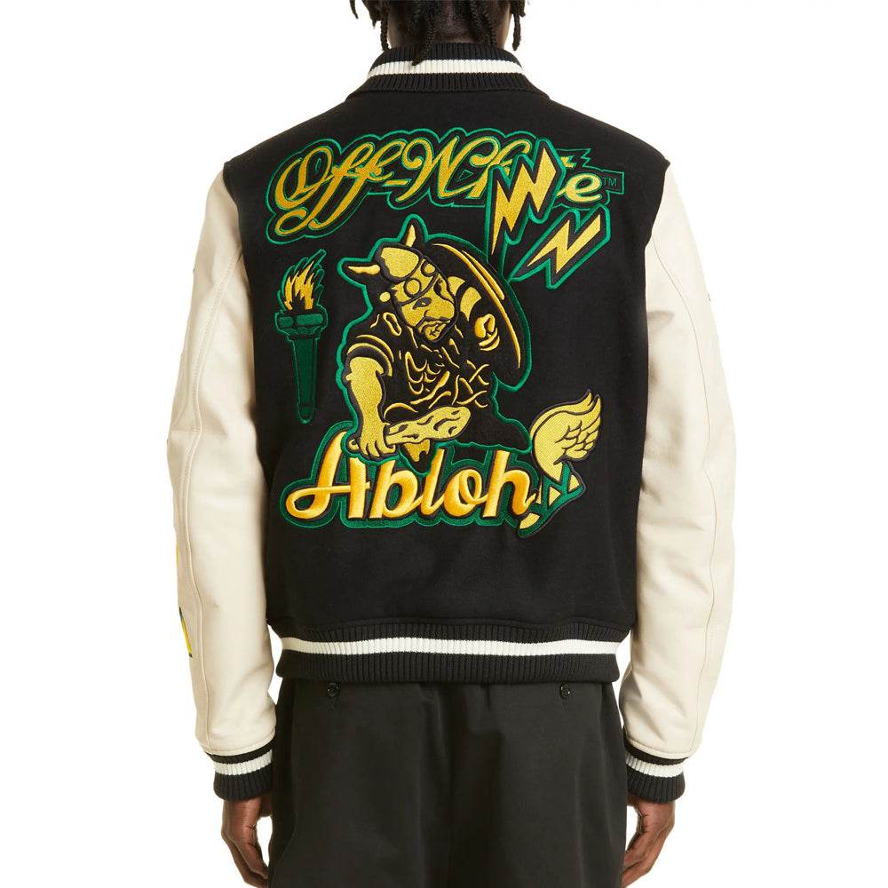 Set the tone for a standout look with this varsity jacket, featuring bold logo patches on the front and a striking warrior graphic on the back. Crafted from a premium wool blend with leather accents, it offers both style and durability.