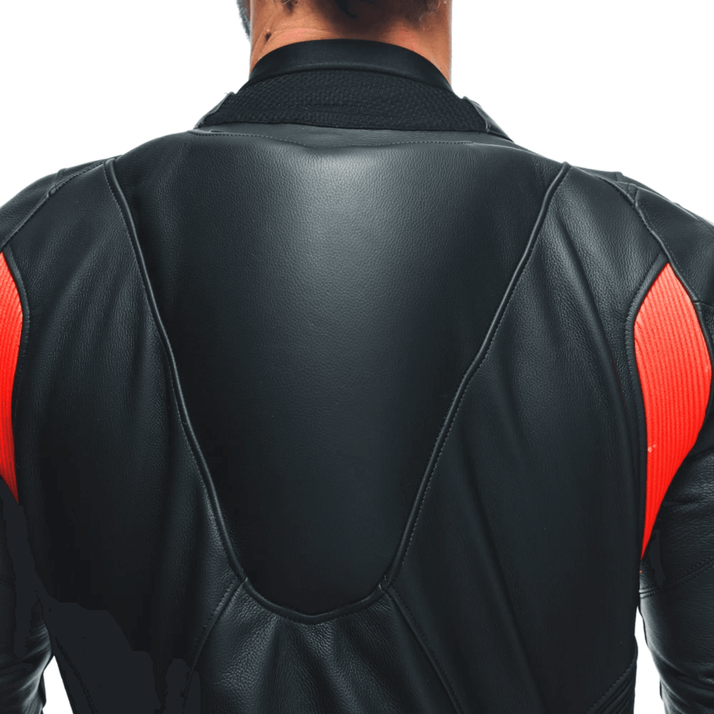 Tosa one-piece motorcycle suit with certification made of premium perforated Tutu cowhide for optimized temperature on hot days. The classic Dainese fit is slim and fitted, while at the same time providing great freedom of movement due to the S1 elastic fabric inserts on the inner arm, groin, and back leg areas. The biaxial stretch fabric inserts on the back, as well as the stretch patches on the knees and shoulder blades, are designed to simultaneously guarantee that all skin is protected, in addition to maximum flexibility and freedom of movement. The special protection system combines Dainese’s classic internal protectors with removable sliders on the knees and interchangeable aluminum plates on the shoulders: A distinctive technology designed to support and facilitate sliding in case of a fall, thus preventing the dangerous risks of rolling caused by grip on asphalt. The aerodynamic hump is designed to accommodate the water bag, which can be connected to the helmet. It is placed at the shoulders and neck to protect the upper back, performing a function complementary to the back protector.