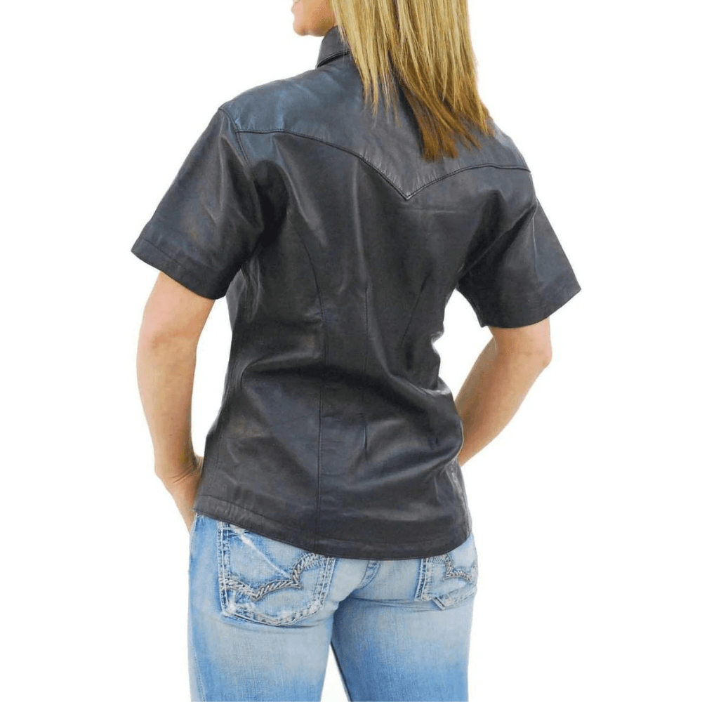 Women's leather shirt in a short sleeve denim style. This ladies black leather shirt features include two flap snap chest pockets, snap down collar and soft nylon lining.