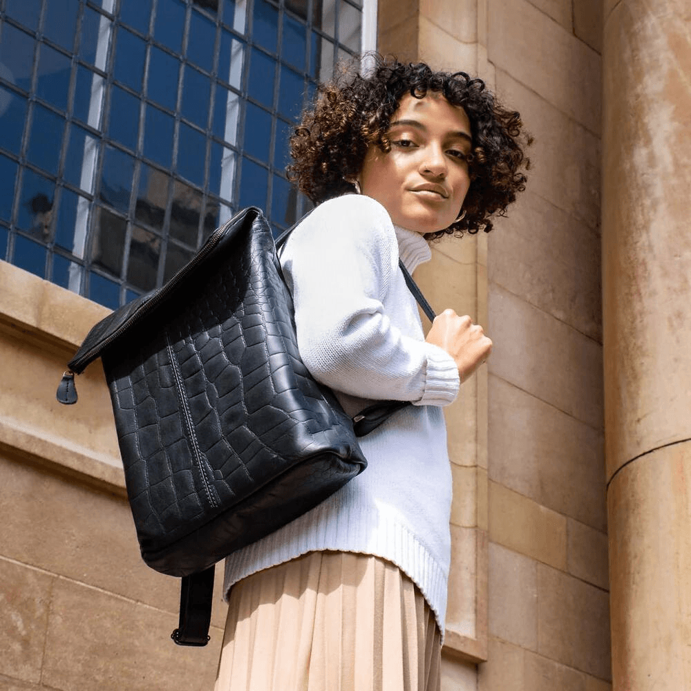 Black Leather Vintage Style Roll Top Backpack | Black Premium Leather Bag Clip Up Backpack | Brown Square Leather Backpack For Work | Classic Black Leather Backpack | Classic Black Leather Backpack | Classic Brown Leather Backpack.